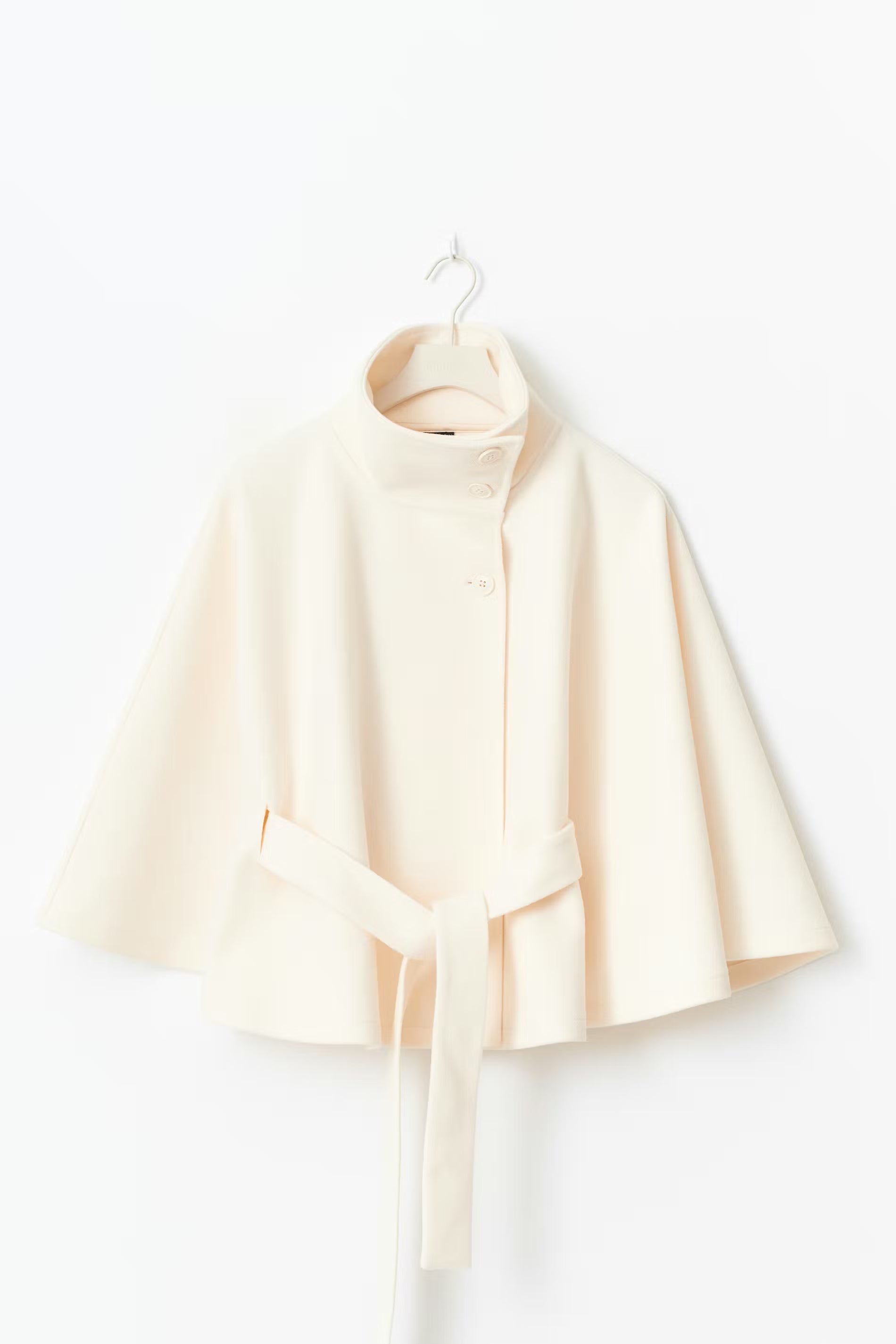Figuur‑definiërende pasvorm: Riem creëert een zachte taille, cape beweegt elegant mee.